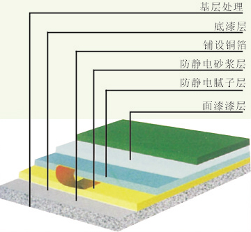 | 面漆層 | 輥涂或噴涂環(huán)氧防靜電面涂材料 | 防靜電環(huán)氧面漆 | — | 0.20~0.30kg/m2 |